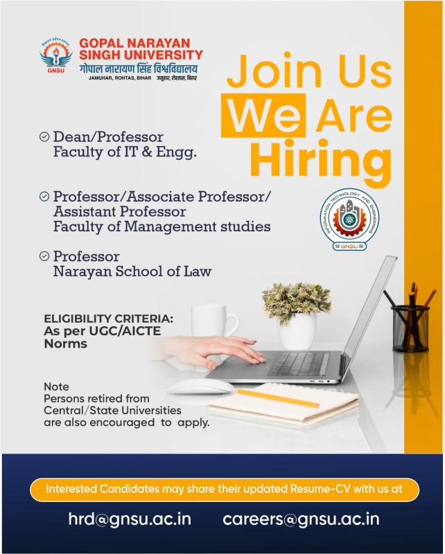 Gopal Narayan Singh University is an equal opportunity employer. If you feel that you have zeal and enthusiasm to accept the challenging roles & responsibilities and you are the one who is diligent & honest, then Gopal Narayan Singh University is the right platform to achieve success.