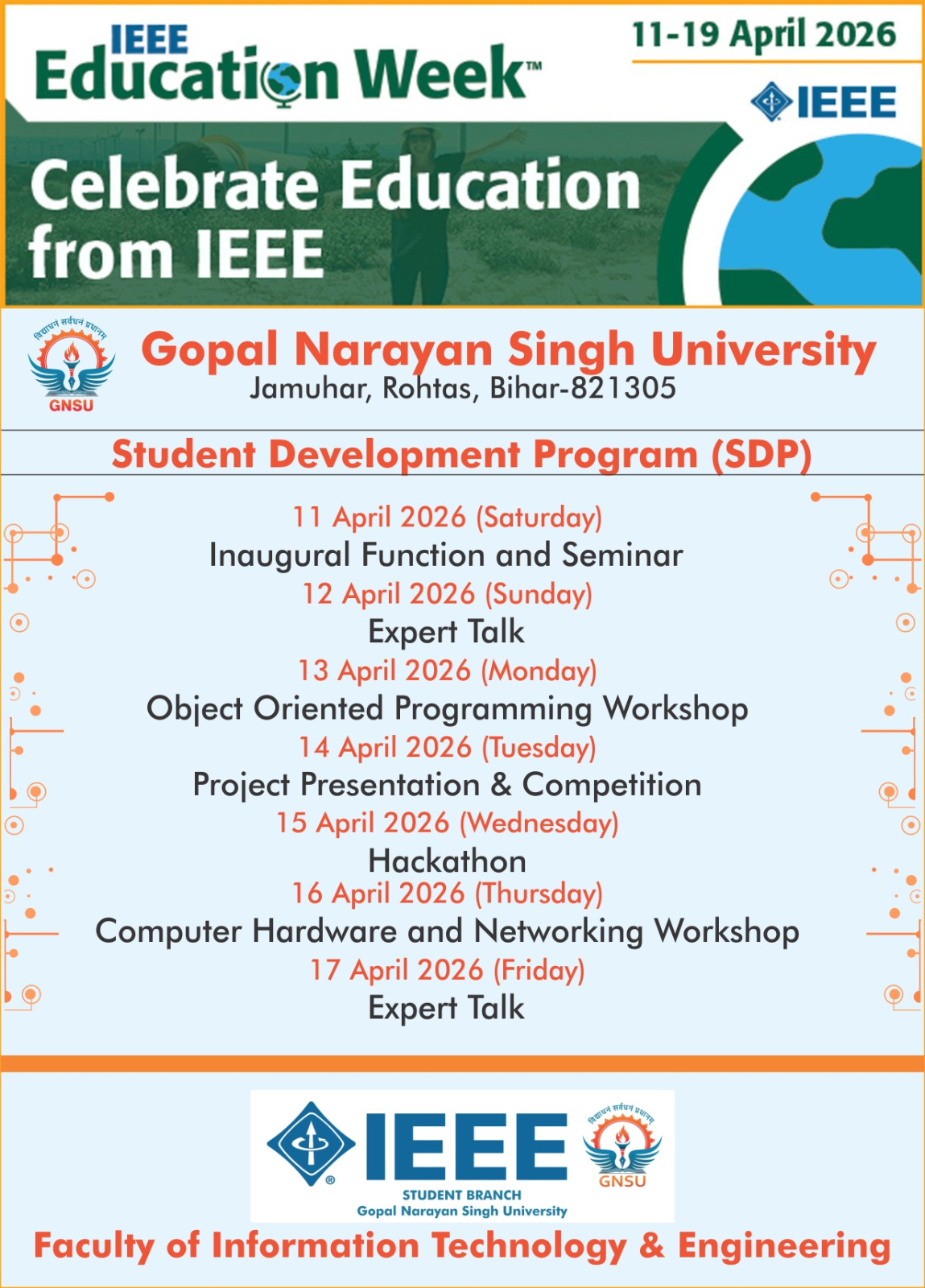 The Student Development Program (SDP), organized as part of IEEE Education Week 2026, is a week-long initiative focused on enhancing technical skills, fostering innovation, and promoting collaborative learning.Hosted by the Faculty of Information Technology & Engineering, GNSU, this program brings together students, educators, and industry experts through a hybrid format-allowing participation both on-campus and online.Participants will gain hands-on experience, engage in competitive events, and learn directly from professionals across various technology domains.