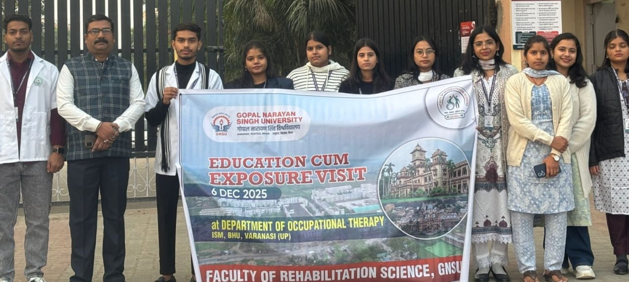 First-year students of the Bachelor of Occupational Therapy (BOT) programme, under the Faculty of Rehabilitation Sciences at Gopal Narayan Singh University, participated in a one-day Educational cum Exposure Visit to the Department of Occupational Therapy, Institute of Medical Sciences, Banaras Hindu University (BHU), Varanasi. The visit included the active involvement of all BOT students along with the teaching and clinical faculty of FRS.