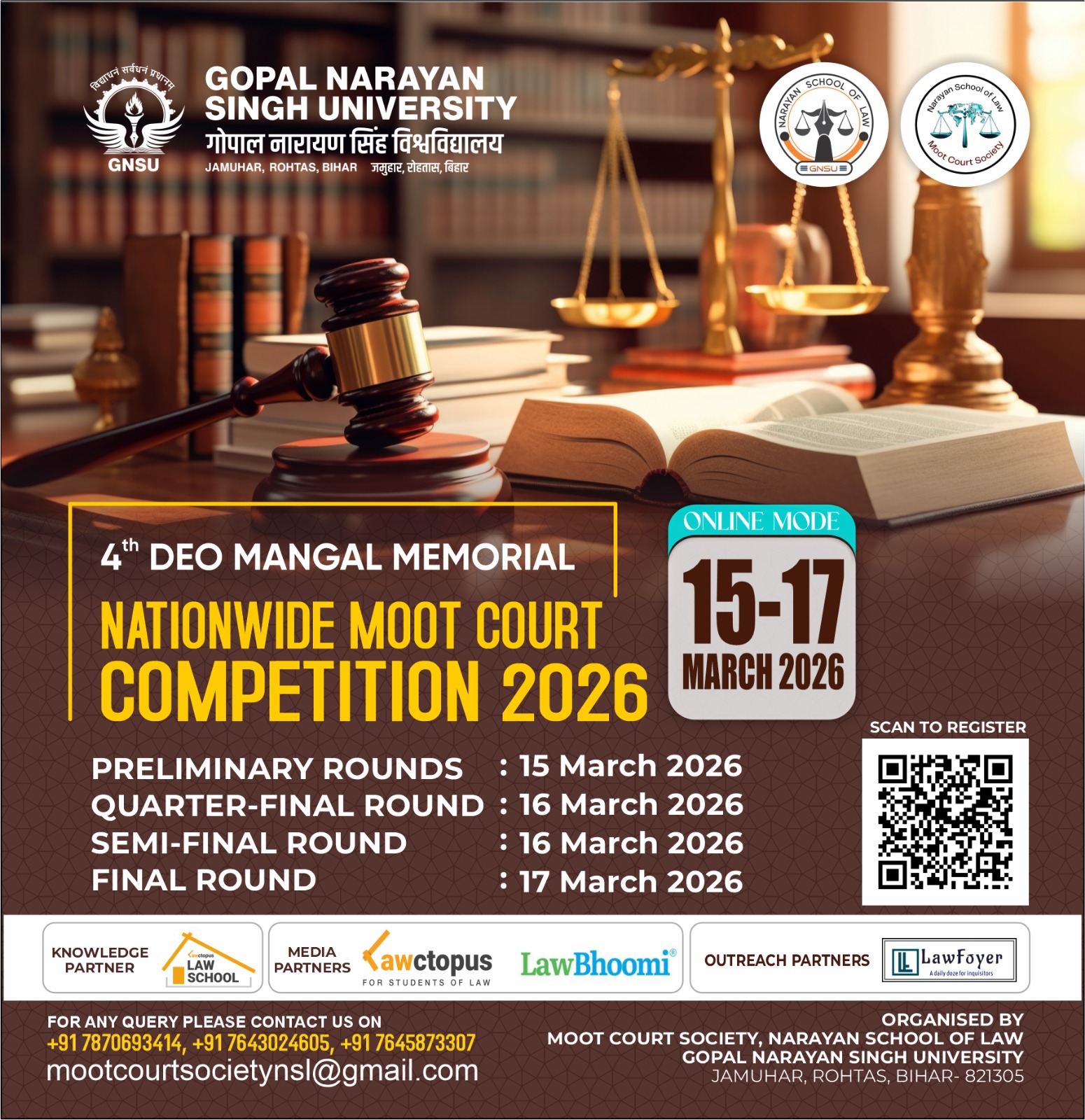 Moot Court Society, Narayan School of Law, Gopal Narayan Singh University proudly announces its 4th Deo Mangal Memorial Nationwide Moot Court Competition, 2026 from 15 March to 17 March 2026 in Online Mode.