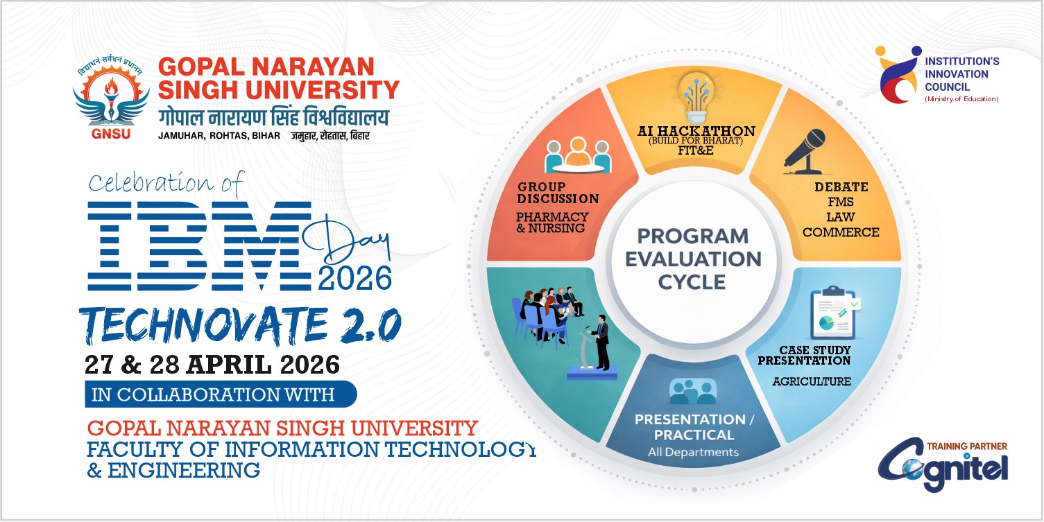 Gopal Narayan Singh University, Jamuhar, Rohtas, Bihar, in collaboration with the Faculty of Information Technology & Engineering and supported by the Institution's Innovation Council, Ministry of Education, is proud to present the Program Evaluation Cycle as part of IBM Day 2026 | Technovate 2.0 on 27 & 28 April 2026.